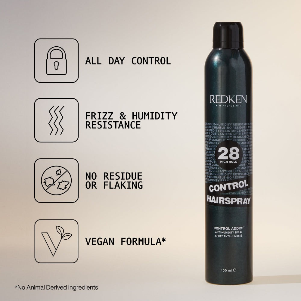 Control 28 Hairspray Anti-Humidity Hairspray 400ml is a strong hold hairspray that offers 24-hour control against humidity without residue or flaking, whilst offering ultimate versatility and flexibility after styling, so you can easily change your styles throughout the day. Perfect for creating that big, bouncy blowdry.