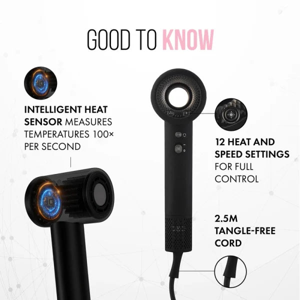 An intelligent microprocessor that maintains consistent airflow and safe temperatures for hair. It measures heat 100 times per second while releasing millions of negative ions to reduce static, smooth frizz, and enhance shine. Safe and effective for all hair types.