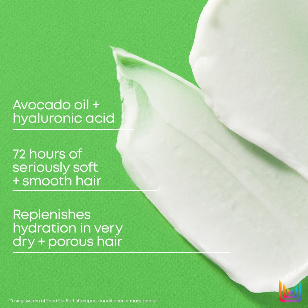 Food For Soft Mask 500ml is a ahir mask for dry hair that is infused with avocado oil & hyaluronic acid to help add moisture and lock in hydration from root to tip for all dry and brittle hair types.