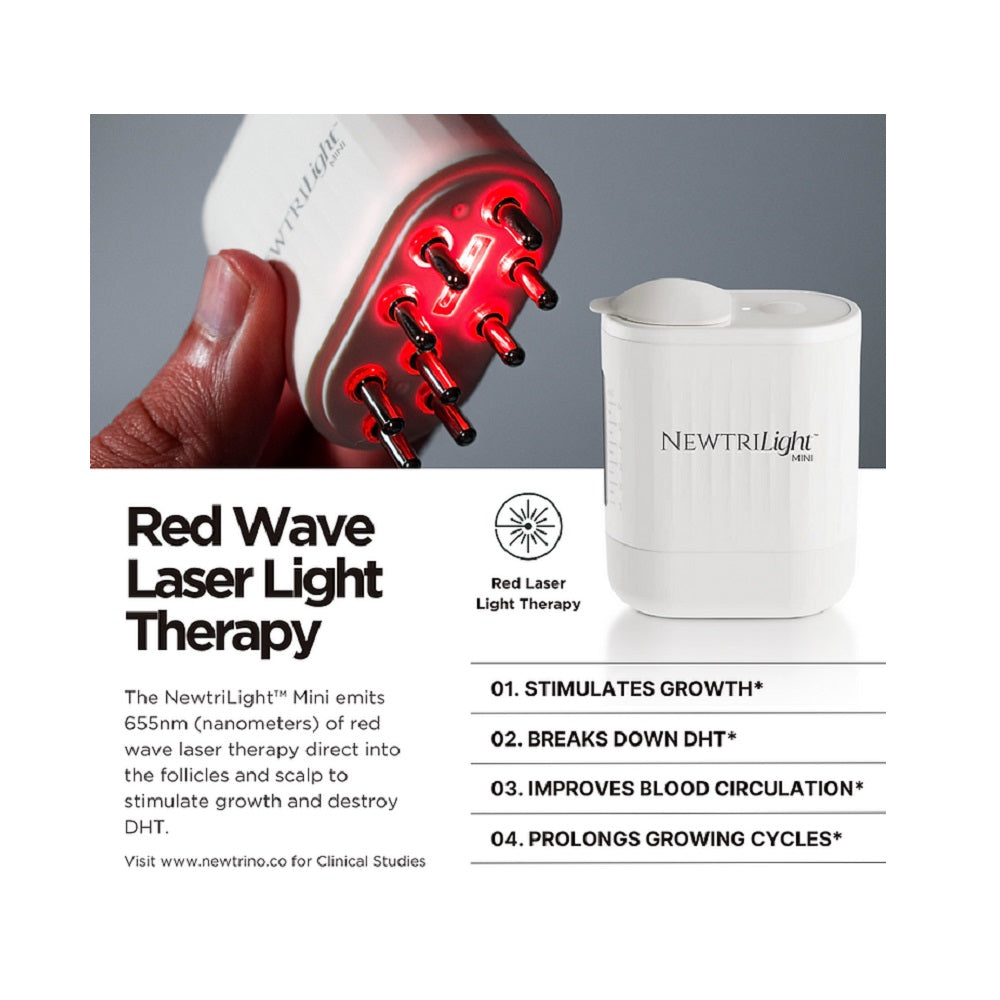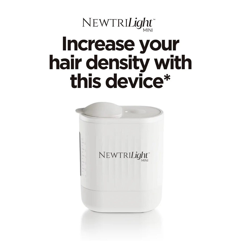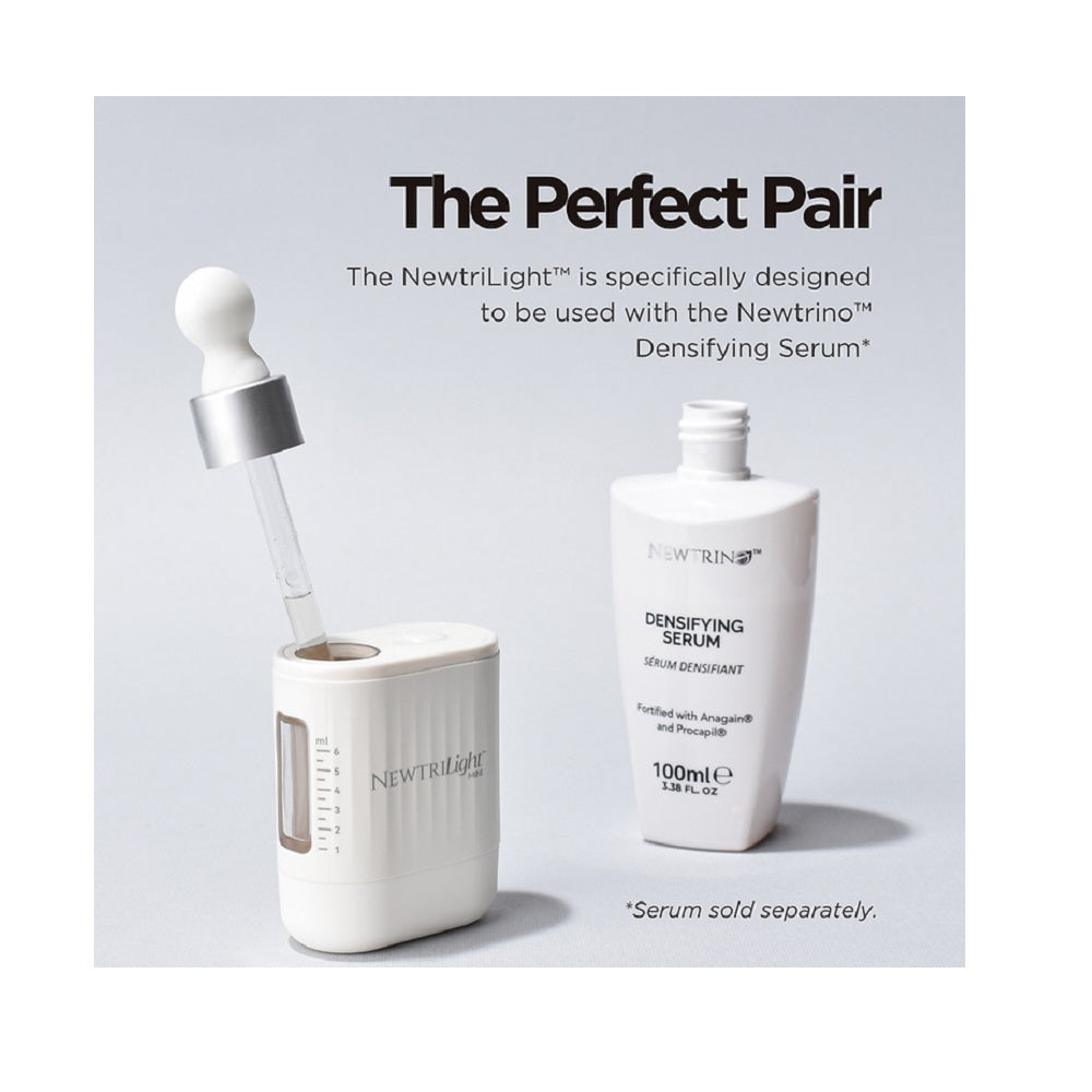 The NewtriLight™ mini is an electronic device that dispenses the Densifying Serum across your scalp. It emits safe, concentrated wavelengths of natural red wave light with stimulating high frequency micro-current vibrations that work deep within your follicles to reduce shedding and increase hair density.